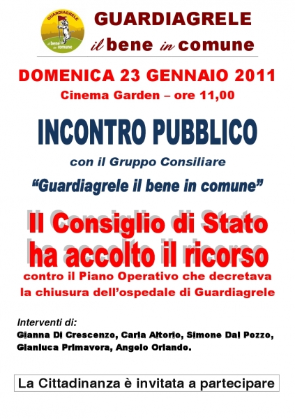Condividi su: Conferenza stampa del Gruppo consiliare "Guardiagrele il bene in comune" all'indomani della sentenza del Consiglio di Stato, che ha di fatto annullato il Piano Operativo sanitario del Presidente Chiodi trasmesso da Rete 8. Condividi su: