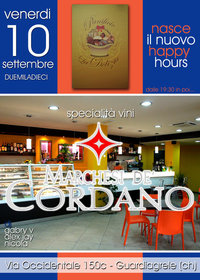 Venerdì 10 settembre nasce il nuovo happy hours con specilità vini "MARCHESI DE CORDANO", dalle 19.00 in poi accompagnata dalla buona musica dei DJ's Gabri V , Alex Jay , Nicola.
