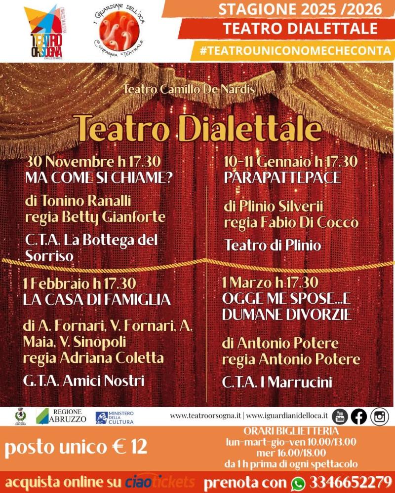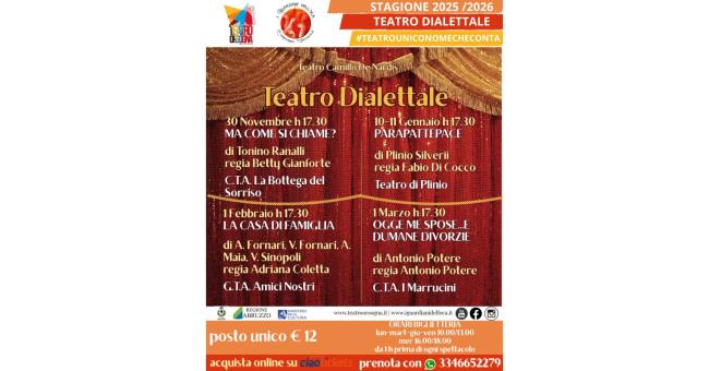 Ultimo appuntamento il 1º marzo alle 17:30 con “Oggè me spose... e dumane divorzie”, opera scritta e diretta da Antonio Potere, portata in scena dal gruppo I Marrucini: una satira brillante sul tema del matrimonio moderno e sulle sue rapide evoluzioni, tra tradizione e ironia pungente.