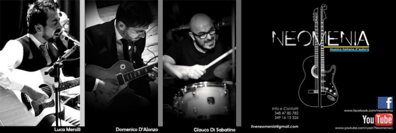 ​SABATO 31 MAGGIO 2014 dalle 19.30 il trio NEOMENIA propone un viaggio emozionante nella storia del cantautorato italiano in versione elettro-acustica, rivisitando celebri canzoni sempre attuali, senza confini di tempo e di spazio, di autori come Modugno, Battisti, Dalla, ma soffermandosi in special modo sul cantautore abruzzese IVAN GRAZIANI. Compongono i NEOMENIA: Luca Merolli alla voce e chitarra acustica, dalla città di mare Vasto (Ch); Domenico D’Alonzo alle chitarre elettriche da Roccascalegna (Ch), borgo medievale ai piedi della Majella con un favoloso castello; Glauco Di Sabatino alle percussioni, dalle dolci colline della provincia di Teramo.