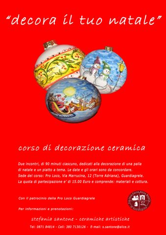 E’ in corso di svolgimento, presso la Pro Loco di Guardiagrele, il corso di ceramica "Decora il tuo Natale", tenuto dalla ceramista Stefania Santone di Guardiagrele. Il corso, articolato in due incontri di 90 minuti ciascuno, prevede la decorazione di una sfera natalizia e di un piatto a tema e sta ottenendo un notevole successo. Stefania Santone è nata a Vasto. Dopo la maturità classica, ha seguito un corso di decorazione ceramica artistica presso il laboratorio del maestro Bontempo e, in seguito, un corso approfondito di decorazione e foggiatura, organizzato dal Comune di Rapino (Chieti) e tenuto dai maestri Tasca e Liberati. Nel 2006 ha frequentato un corso organizzato dalla Regione Abruzzo e conseguito il diploma di "Operatore della ceramica artistica" con la massima valutazione. Da anni vive e lavora a Guardiagrele. La bellezza dei luoghi, caratterizzati da una natura ancora incontaminata e lussureggiante, l’ha ispirata nella realizzazione di opere ricche di qualità e originalità. Grazie alle sue ormai note qualità artistiche, da anni partecipa regolarmente alla “Mostra dell’Artigianato Artistico della Majella” di Guardiagrele, dove nel 2006 si è aggiudicata il primo premio al concorso biennale a tema. Attualmente collabora con scuole ed enti. E' possibile ancora, aderire ai corsi che si terranno fino al 15 dicembre 2011 nei locali della ProLoco di Guardiagrele (Torre Adriana), telefonando ai n. 380/7130126 o 0871/84814 o scrivendo alla mail s.santone@alice.it.