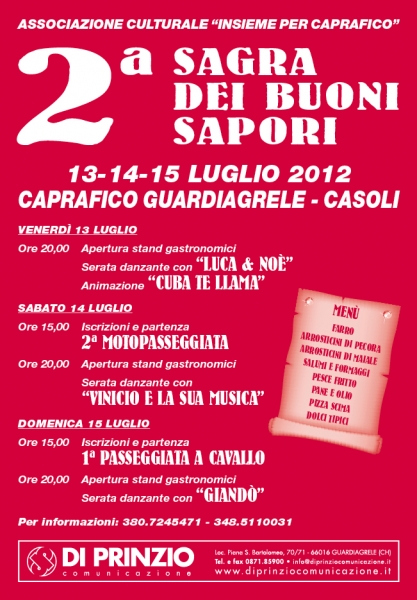 Inizierà Venerdì sera alle ore 20, con l’apertura degli stands gastronomici e la serata danzante firmata prima dalla musica di "Luca e Noè" e a seguire dall'animazione della scuola di ballo Cuba Te LLama , la seconda edizione della “Sagra dei Buoni Sapori” organizzata dall’Associazione Culturale “Insieme per Caprafico”.