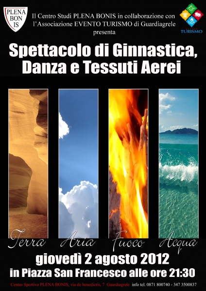 Questa sera, 2 agosto 2012 alle ore 21.30, il Centro Studi Plenabonis e l’ Associazione Evento Turismo presentano lo Spettacolo di Ginnastica, Danza e Tessuti Aerei.