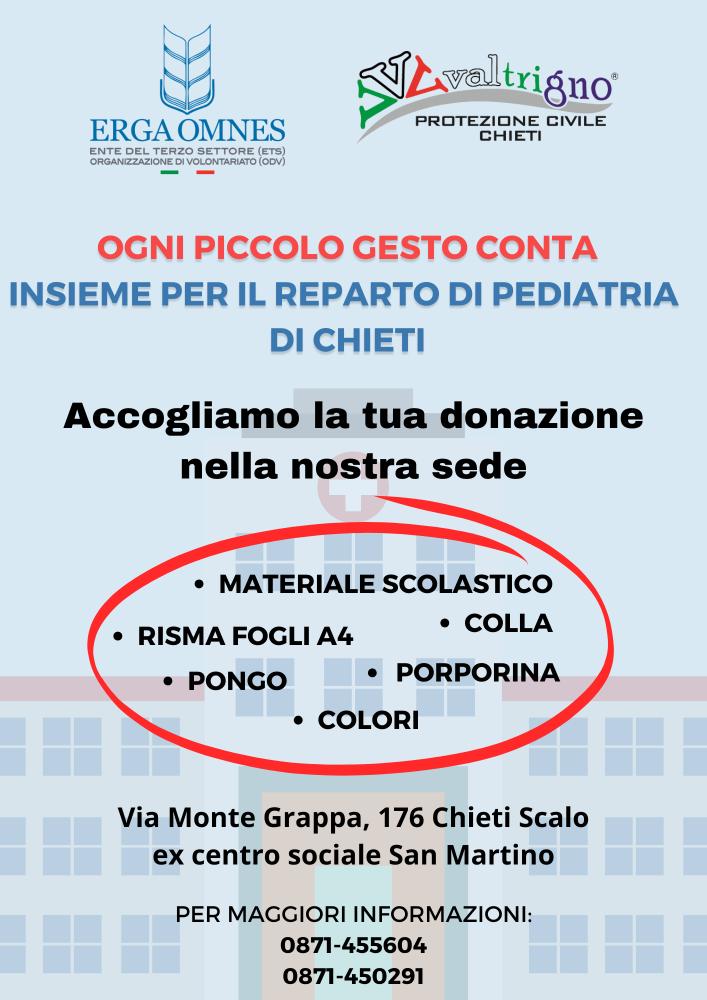 Le due associazioni stanno raccogliendo materiale scolastico da donare ai bambini ricoverati nel reparto di Pediatria dell’Ospedale Clinicizzato SS. Annunziata di Chieti, per regalare loro un momento di svago e apprendimento durante il ricovero.