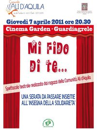 “Mi fido di te” è il titolo dello spettacolo teatrale che giovedì sera 7 aprile, a partire dalle 20.30 al cinema Garden, viene presentato dalla comunità di recupero “Ali d’aquila” di Chieti, gestita e promossa dall’Associazione Centro Solidarietà Incontro Ascolto e prima Accoglienza.