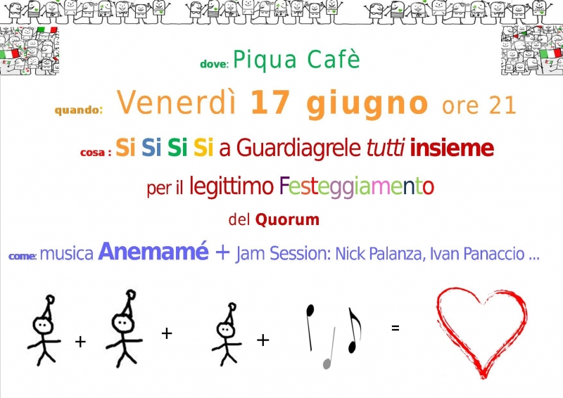 Domani, Venerdì 17, siamo tutti invitati a partecipare al party "SI SI SI SI LEGGITTIMO FESTEGGIAMENTO", l' evento pensato per celebrare il raggiungimento del Quorum.