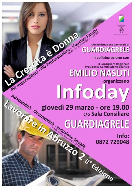 Il Consigliere Regionale Emilio Nasuti, Presidente 1^ Commissione Bilancio e Affari Generali, presenzierà al convegno che si terrà giovedì 29 Marzo 2012, ore 17, presso la Sala di Conversazione di Lanciano (Piazza Plebiscito) per illustrare agli interessati le opportunità in merito ai finanziamenti a fondo perduto stanziati dalla Regione Abruzzo in materia di lavoro contenuti nei nuovi bandi: