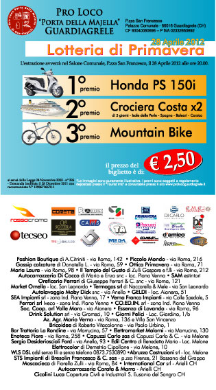 Sabato 28 aprile alle ore 20 presso il Salone Comunale di Guardiagrele alla presenza del Sindaco dott. Salvi, del Presidente del Consiglio Comunale Simeone Domenico, degli Agenti di Polizia Municipale Eugenio Orlando e Nico Di Prinzio, del Presidente della Pro Loco di Guardiagrele Antonio Verna e di alcuni testimoni riportati nel verbale steso dalla Segretaria Mariangela Tinari, si sono svolte le operazioni di estrazione dei biglietti della "Lotteria di Primavera" della Pro Loco di Guardiagrele.