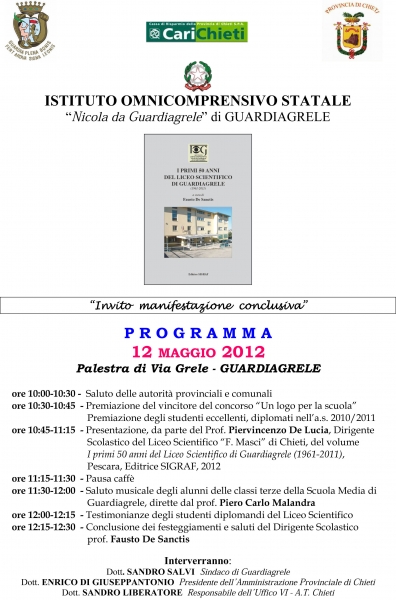 Sabato 12 Maggio alle ore 10 presso la palestra di Via Grele si terrà la “manifestazione conclusiva presentata” dall’Istituto omnicomprensivo statale “Nicola da Guardiagrele” alla quale parteciperanno tutte le classi del Liceo Scientifico, dell'Istituto Tecnico Settore Economico e della Scuola Media. Il Liceo Scientifico di Guardiagrele è stato istituito nell'anno scolastico 1961/62 come sede staccata dello Scientifico di Chieti e successivamente aggregato a quello di Lanciano, e di Francavilla.
