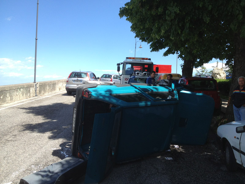 Dalle prime ricostruzioni dei fatti, il conducente di una Fiat Panda vecchio modello, che procedeva in direzione Cappuccini, in piena curva ha perso il controllo della vettura che ha prima strisciato il muro di cinta della curva stessa, per poi finire prima contro un albero sul lato opposto della strada e infine ribaltarsi urtando una vettura parcheggiata entro le strisce.