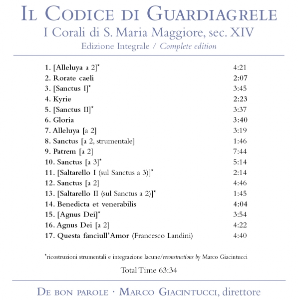 Il compact-disc, intitolato Il Codice di Guardiagrele, è stato pubblicato lo scorso mese di settembre dalla casa discografica Tactus di Bologna, specializzata nella riedizione di “musica antica” e nella riscoperta di musicisti e compositori, soprattutto italiani, attivi tra medioevo, rinascimento e prima età barocca. Autori delle parti polifoniche e strumentali sono i componenti dell’ensemble De bon parole, egregiamente diretti da Marco Giacintucci, che è anche l’autore delle ricostruzioni strumentali, della concertazione e dei testi del libretto allegato al cd. Ai brani gregoriani eseguiti dalla Schola si alternano musiche su strumenti d’epoca, quali la viella, la cornamusa, i flauti dolci, l’organo e i “tamburi a cornice”, le cui seducenti costruzioni armoniche spesso si intrecciano con le parti polifoniche in un dialogo tra sacro e profano affascinante e coinvolgente. I 17 brani registrati, oltre un’ora di musica, sono integrati da esaustive ed interessantissime note musicologiche nel libretto allegato, in particolare per quanto concerne le varie parti polifoniche dei codici e la loro strutturazione; ovviamente molto interessante anche la conclusione dedicata agli strumenti utilizzati, a volte filologicamente ricostruiti sulla base delle testimonianze pittoriche presenti in alcuni edifici medievali abruzzesi. Bella la copertina, raffigurante la miniatura della Pentecoste, foglio staccato dal terzo volume dell’Antifonario e fortunatamente recuperato.