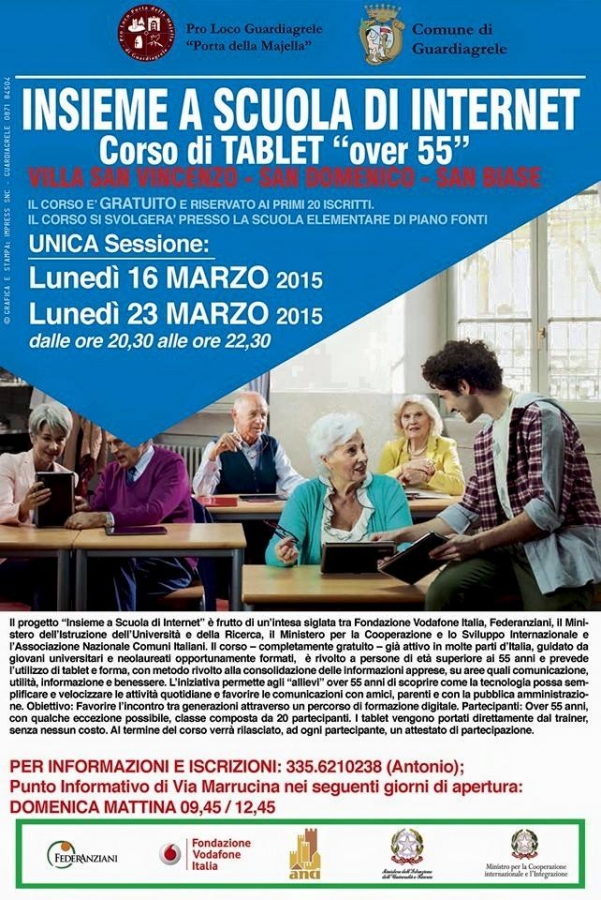 Il corso, organizzato dalla Pro Loco di Guardiagrele ed in particolare seguito dal Vice Presidente Erika Di Filippo, in collaborazione con la Fondazione Vodafone Italia e Federanziani, sarà completamente gratuito.