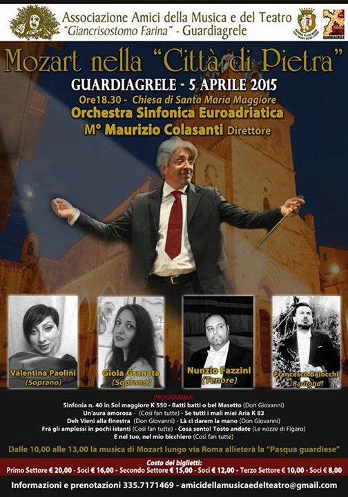 Il 5 aprile 2015, infatti, grazie all'evento organizzato sapientemente dall'Associazione Amici della Musica e del Teatro “Giancristofaro Farina” di Guardiagrele, la nostra “Città di Pietra” ospiterà, presso la Chiesa di Santa Maria Maggiore, il talento e la passione dell'Orchestra e di quattro nomi della musica classica contemporanea: