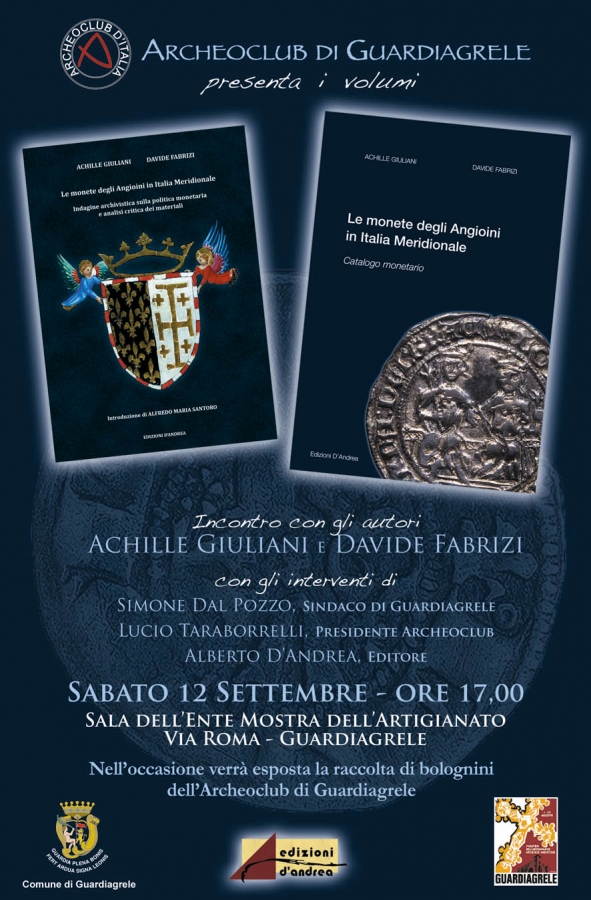 Sabato 12 settembre, alle ore 17, nella sala polifunzionale dell’Ente Mostra dell’Artigianato in via Roma, l’Archeoclub di Guardiagrele presenterà due splendidi volumi sulla produzione monetaria nell’Italia meridionale al tempo degli Angioini, ultima fatica di Achille Giuliani e Davide Fabrizi, entrambi membri della Società Numismatica Italiana Si tratta di un corposo testo contenente un’accurata indagine archivistica sulla politica monetaria della dinastia angioina, con analisi critica dei materiali, e di un curatissimo catalogo, di grande formato, che illustra in maniera dettagliata la produzione numismatica a partire dalle emissioni di Carlo d’Angiò. Un’attenzione particolare è stata ovviamente riservata alle monete prodotte nella zecca di Guardiagrele, i famosi bolognini d’argento, coniati tra la fine del Trecento e la prima metà del Quattrocento, durante il regno di Ladislao di Durazzo e di sua sorella Giovanna II d’Angiò.