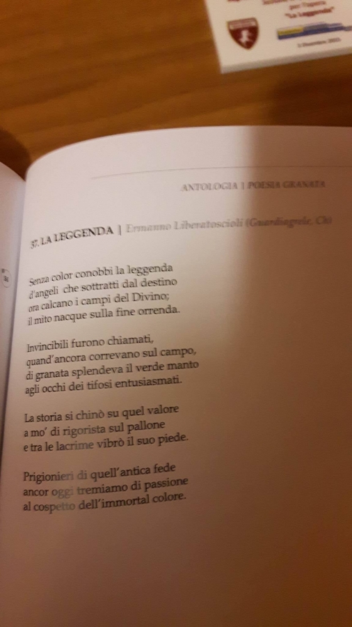 Con la poesia "LA LEGGENDA", è riuscito a mettere in versi un evento che ha segnato profondamente la sua squadra del cuore. Parole calde, dense di significato, racchiudono in un sonetto il suo essere sportivo, tifoso, vero granata: