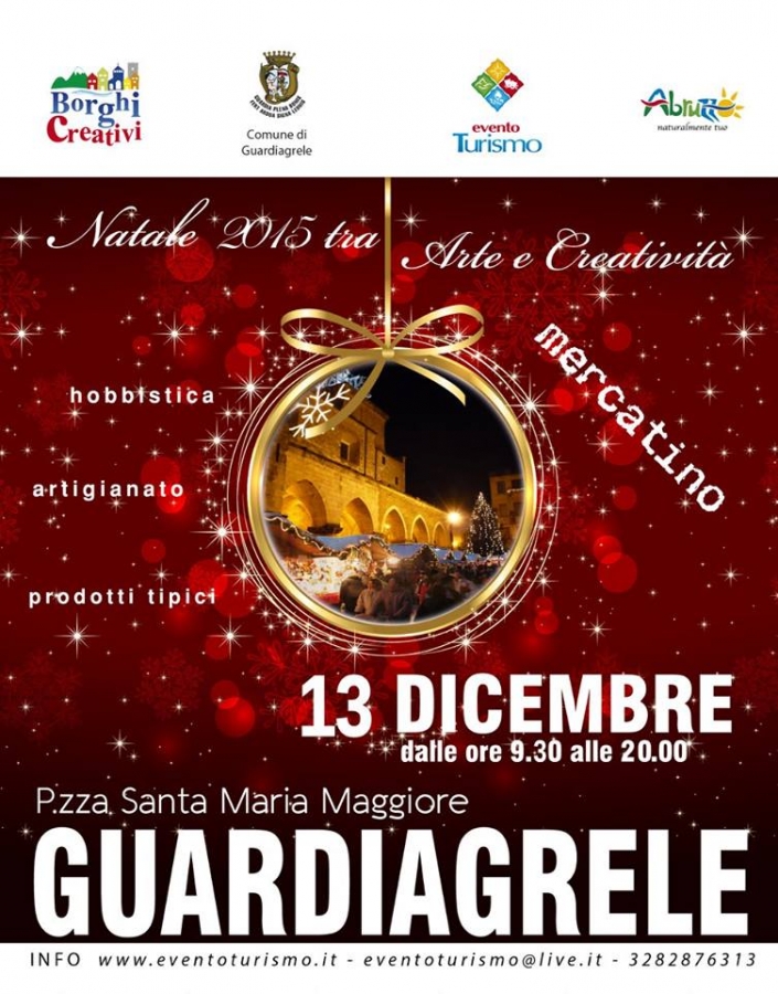 Ad addobbare la splendida cornice storica di Guardiagrele torna il Mercatino di Natale a cura dall'Associazione Evento Turismo, ormai alla IV Edizione, Domenica 13 Dicembre dalle ore 9.30 alle ore 20.00 in p.zza Santa Maria Maggiore.