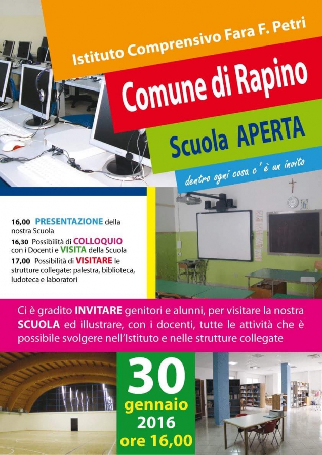 La Scuola Primaria e Secondaria di Rapino apre le porte ai suoi futuri allievi e a tutti coloro che vorranno informazioni su corsi, docenti e didattica del polo rapinese.