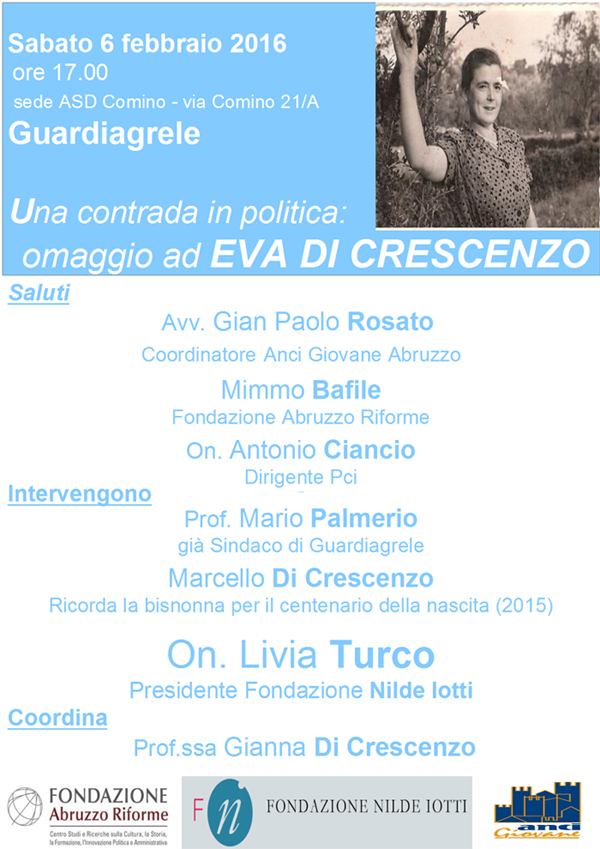 Che sia vero o meno questo antico adagio si sposa perfettamente con la protagonista dell'incontro che dalle 17.00 si terrà presso l'Asd Comino in ricordo del centenario della nascita di Eva Di Crescenzo, militante nelle file del PCI dal dopoguerra agli anni settanta, anima di un'intera contrada, donna forte in un periodo nel quale proprio la forza delle donne è stata determinante per cambiarlo quel destino scritto nel proprio codice genetico.