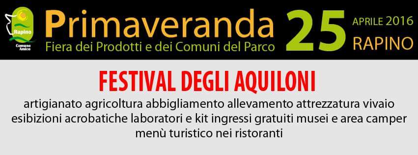La manifestazione, organizzata dall'Amministrazione Comunale di Rapino con il patrocinio della Provincia di Chieti e del Parco Nazionale della Majella, si terrà dalle 09.00 alle 19.00 del 25 Aprile a Rapino (Infopoint: Area Fiera) e coinvolgerà grandi e bambini con un ricco calendario di appuntamenti tra i quali la seconda edizione del FESTIVAL DEGLI AQUILONI, con laboratori di tecniche di costruzione e di guida, kit per famiglie ed esibizioni acrobatiche.