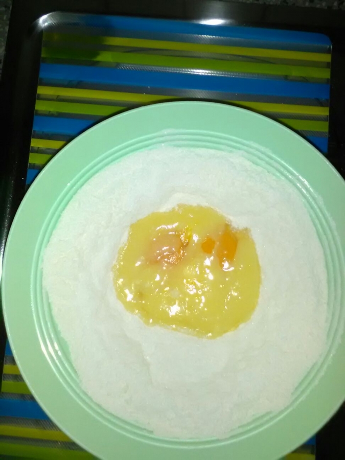 Disponete a fontana i due tipi di farina e mettete al centro le uova, il tuorlo, lo zucchero, il burro e il sale. Lavorate l'impasto fino ad avere un composto omogeneo.