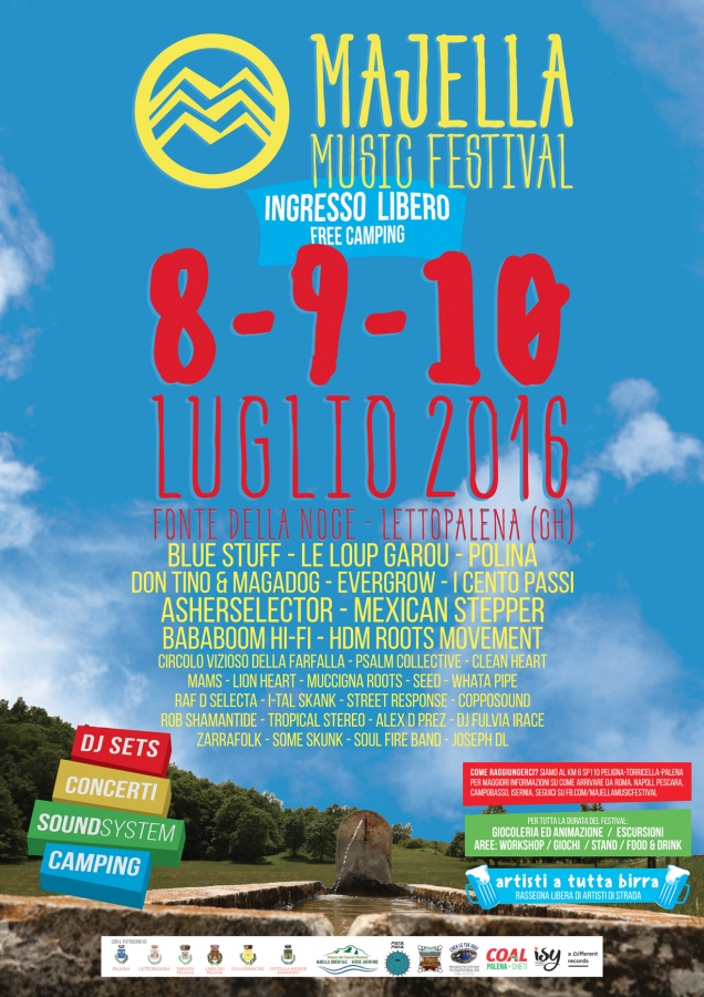 Chieti, 30 giugno 2016 – Tutto pronto per Majella Music Festival dall’8 al 10 luglio a Lettopalena (Ch) nella splendida ed unica cornice naturale di Fonte della Noce. Tre giorni di musica e non solo, organizzati dall’associazione culturale Spread Love con il patrocinio dei Comuni di Lettopalena, Palena, Taranta Peligna, Lama dei Peligni, Colledimacine e Civitella Messer Raimondo, che vedranno come protagonisti musicisti e artisti internazionali, nazionali e locali.