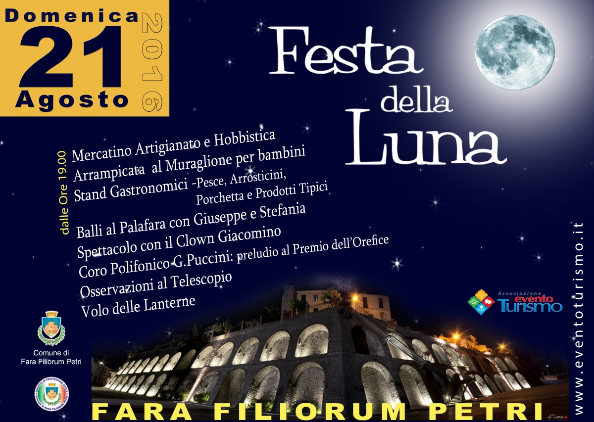 Un evento da non perdere! Ricco di musica, artigianato, prodotti gastronomici locali e buon vino. Una serata illuminata dalla luce argentea del corpo celeste che più ha suggestionato poeti e scienziati. Domenica 21 Agosto la cornice del Centro Storico di Fara Filiorum Petri accoglierà la III Edizione della Festa della Luna promossa dal Comune di Fara Filiorum Petri e realizzata in collaborazione con l’Ass. Evento Turismo ed  il Gruppo Comunale di Protezione Civile di Fara Filiorum Petri.