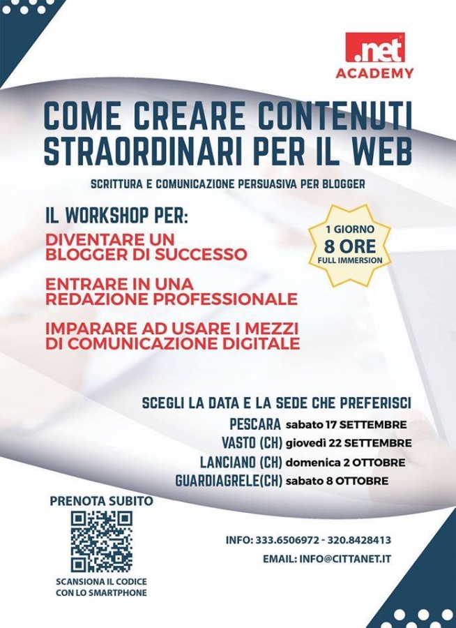 Full immersion nel mondo del web: 8 ore in cui vi saranno svelati tutti i segreti per diventare un blogger di successo, entrare in una redazione professionale, imparare ad usare i mezzi di comunicazione digitale.