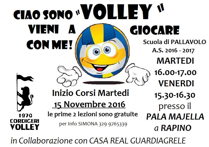A partire da martedì 15 Novembre 2016 si darà inizio ai corsi di Scuola di Pallavolo presso il Pala Majella di Rapino.