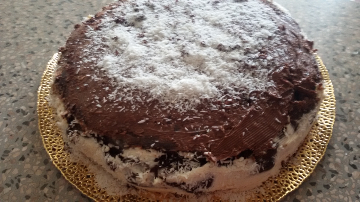 Una volta sfornata la torta, lasciatela raffreddare completamente. Tagliatela, poi, in modo da ricavare uno o due strati (a piacere). Bagnate ciascuno strato e versatevi la crema al mascarpone e cocco, ottenuta mescolando i due ingredienti con lo zucchero, e tenetene un po' da parte per il contorno.