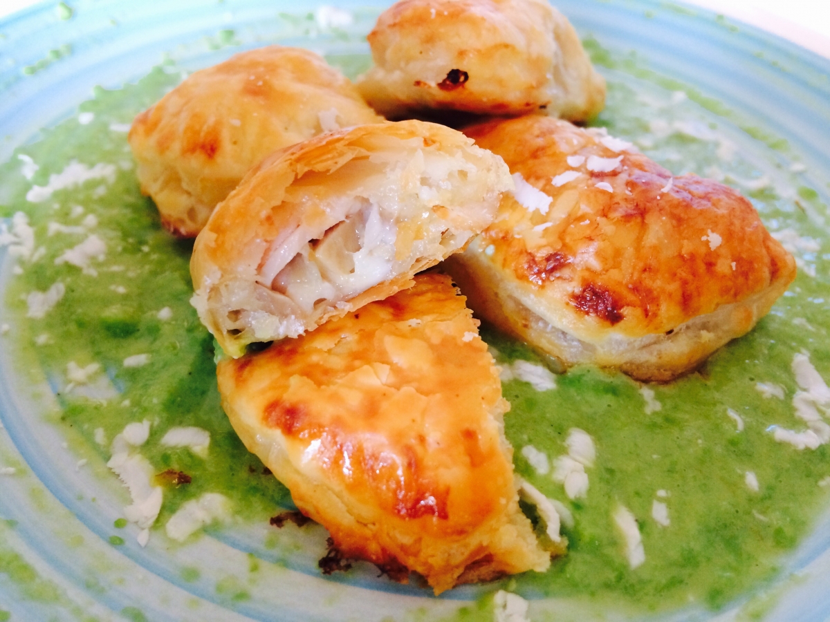 -Per la crema: 1 spicchio d'aglio, 100g di piselli, sale, olio, pepe q.b., 40g di formaggio spalmabile -Per la sfoglia: 1 rotolo di pasta sfoglia, olio, sale, 100g di funghi champignons, 2-3 fette di petto di pollo affettato, 1 mozzarella, latte q.b., rosmarino q.b.