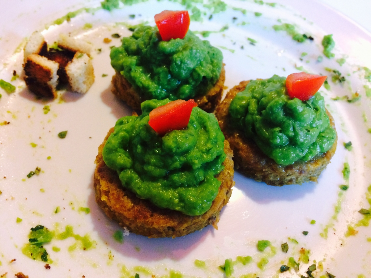 Un dolce che in realtà non lo è: la crema è di piselli e zucchine, insaporita con sale e pepe, e, in superficie, al posto della “ciliegina sulla torta”, abbiamo messo un pomodorino.