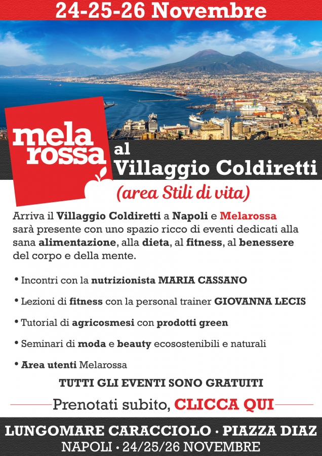 Incontri con i nutrizionisti, lezioni di fitness, tutorial di bellezza con prodotti naturali, seminari di moda ecosostenibile: dal 24 al 26 novembre, Melarossa.it torna protagonista con il suo team di esperti al Villaggio degli agricoltori Coldiretti di Napoli (lungomare Caracciolo  - Rotonda Diaz).