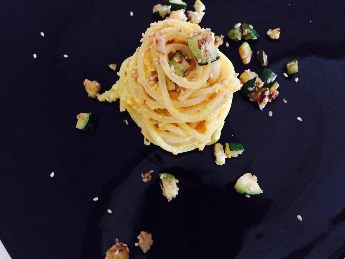 Esso farà da "cornice" a degli spaghetti avvolti da una crema di ceci e curcuma, esaltati nel sapore dalla consistenza croccante della zucchina saltata in padella e "condita", anch'essa, con del sesamo.