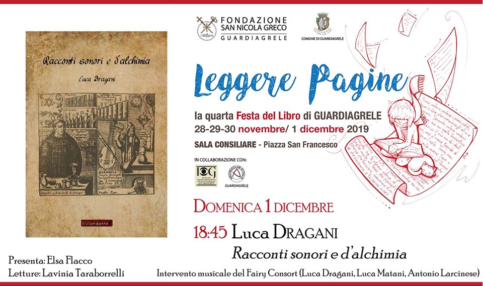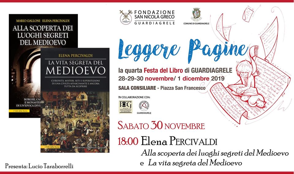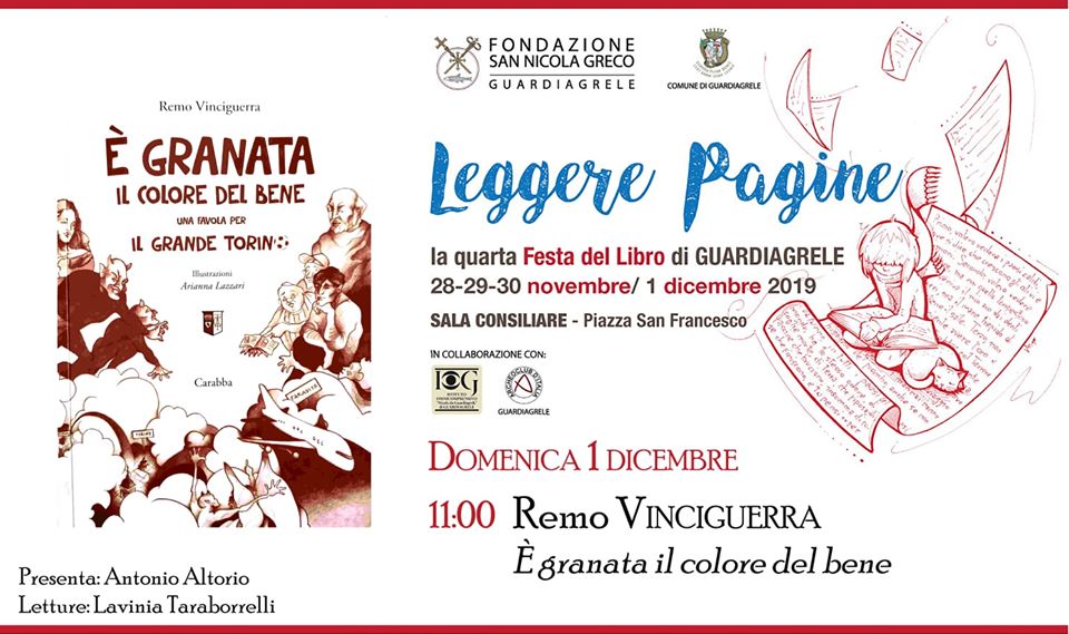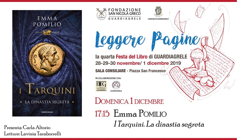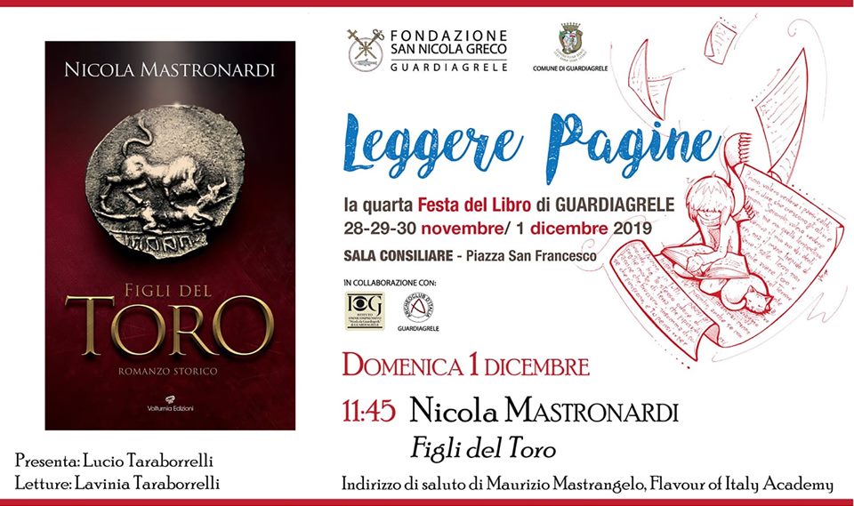 La quarta ed ultima giornata del festival, il 1° dicembre, si aprirà alle ore 11 con la favola “È granata il colore del bene” (Editrice Carabba), di Remo Vinciguerra, la vicenda del grande Torino conclusasi tragicamente sulla collina di Superga. A seguire, la prima presentazione assoluta nazionale dell’attesissimo romanzo storico “Figli del Toro” (Volturnia Edizioni), secondo episodio della trilogia di “Viteliù” dello scrittore agnonese Nicola Mastronardi, che ha raggiunto una celebrità straordinaria raccontando l’epopea dei Sanniti e delle popolazioni italiche insorte contro Roma durante la Guerra Sociale. Nel pomeriggio gli ultimi quattro appuntamenti: alle ore 16.30 lo scrittore aquilano Stefano Carnicelli presenterà “Parole invisibili” (Tralerighe Libri), un viaggio nei tortuosi labirinti dell’autismo. Alle 17.15 sarà la volta di un altro romanzo storico, uscito dalla penna di una affermata autrice del genere, Emma Pomilio: “I Tarquini. La dinastia segreta” (Mondadori Ed.), che racconta l’ascesa e la caduta dei re etruschi della Roma delle origini. A seguire, alle 18, un ponderoso saggio sulla “Storia della massoneria in Abruzzo” (Artemia Nova Editrice) curato da Loris Di Giovanni ed Elso Simone Serpentini, con inedite ed inaspettate trame che coinvolgono anche la nostra Guardiagrele, e alle 19 il libro “Racconti sonori e d’alchimia” (Edizioni Il Viandante) di Luca Dragani, che condurrà il pubblico lungo un insolito viaggio tra musici e alchimisti di ieri e di oggi, un viaggio anche sonoro, grazie agli intermezzi musicali del gruppo di musica antica Fairy Consort, con lo stesso Luca Dragani ai flauti, Luca Matani ai violini e Antonio Larcinese alla tiorba. Lavinia Taraborrelli leggerà brani scelti delle opere di narrativa presentate nel corso del festival.