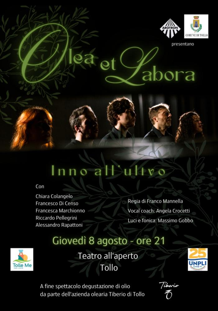 La rassegna teatrale "Tutti in scena" di Tollo chiude con un omaggio all'olio, all'ulivo e alla terra, il tutto concentrato in "Olea et labora" a cura della Compagnia dell'Aratro di Pianella (Pe), per la regia di Franco Mannella.