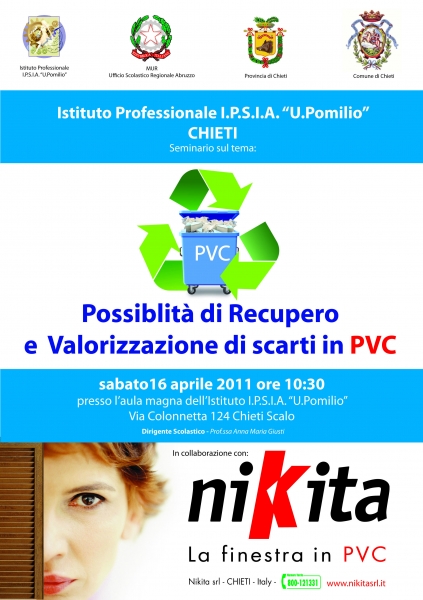 Un'azienda leader nel settore, un’aula magna colma di ragazzi, due ingegneri freschi di studi per un’idea creativa ed innovativa. Un connubio tra Nikita, I.P.S.I.A. “U.Pomilio” di Chieti Scalo, Mattia Belfiglio e Marco Capuzzi che ha come obiettivo quello del riutilizzo degli scarti di PVC. Passando dalle analisi sulle caratteristiche di tale materia prima ed arrivando allo stato dell’arte del riciclo e riuso nel nostro paese.