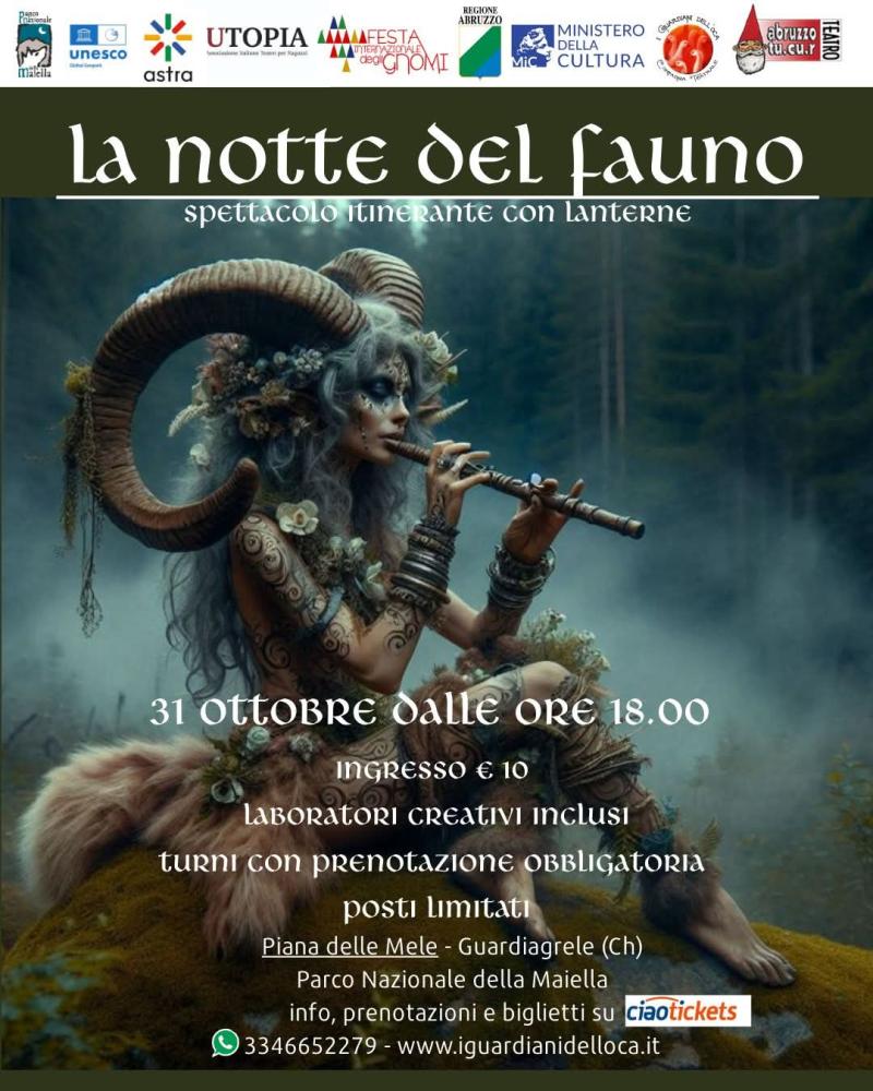 A Piana delle Mele, nel cuore di Guardiagrele, la notte di Halloween si accende di incanto e mistero insieme ai Guardiani dell’Oca. A partire dalle 18:00 i boschi e i sentieri si popolano di elfi, gnomi, folletti, fate e Fauni pronti a incantare grandi e piccini con atmosfere fiabesche e incontri sorprendenti e accompagnarli in un viaggio fuori dal tempo, dove la fantasia si intreccia con l’atmosfera antica della festa più magica dell’anno. Laboratori creativi a tema per tutti i bambini, zucche illuminate, luci soffuse, musica, profumi, racconti che richiamano le antiche leggende del bosco per una Notte delle Streghe da non perdere.