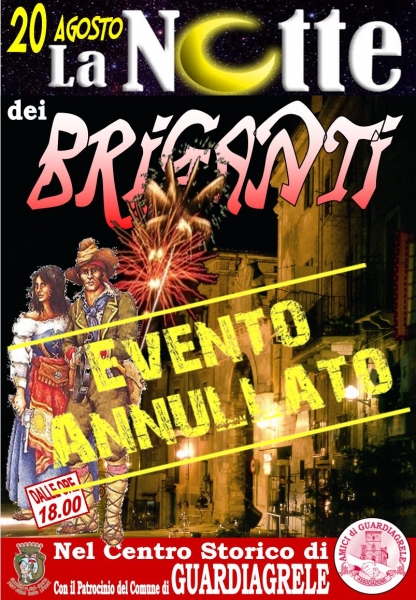 L’Associazione si scusa con la cittadinanza, anche se deve sapere che è unicamente colpa delle scelte insensate di qualcun altro se viene privata di una di quelle manifestazioni che più richiamano gente e turisti e che, come ben sa, solo gli «Amici di Guardiagrele» sanno organizzare. Ed esprime amarezza e sdegno perché l’unicità della manifestazione e il notevole impegno servivano per richiamarvi più gente possibile visto che, l’ AssociAzione «Amici di Guardiagrele», la faceva per raccogliere fondi da destinare alla ricostruzione e riapertura della chiesa del Nostro Patrono San Donato, ma dopo il boicottaggio dello scorso anno e ora, davanti a questa ennesima presa per i fondelli, vuol dire che quest’anno, quantificati i danni, destineremo il restante in cassa per i lavori alla chiesa, e poi, da buoni «briganti», ce ne ritorneremo in montagna dove la serietà può spaziare.