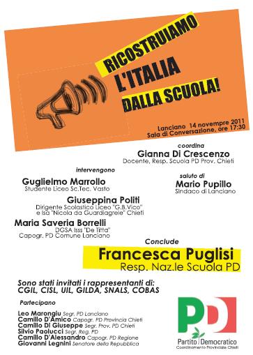 Nell'ambito della mobilitazione nazionale "La scuola è il futuro. Il Governo la cancella. Riscrivila con noi", il coordinamento provinciale PD Chieti invita a partecipare all'incontro-dibattito "Ricostruiamo l'Italia dalla scuola" che si terrà a Lanciano il 14 novembre 2011, alle ore 17:30, presso la Sala di conversazione.