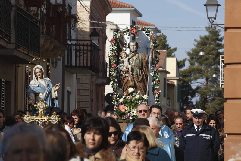 I confetti, tra l’altro un prodotto tipico dell’abruzzo antico, vengono acquistati e confezionati in ciuffetti di tulle da membri della Congrega di San Giuseppe e dai loro familiari e vengono poi benedetti dal Parroco locale, che li sistema in grandi ceste ai piedi dell’altare. La tradizione dei confetti è molto antica ed è legata al sogno di un membro della Congregazione al quale apparse in sogno San Giuseppe chiedendo confetti per il suo sposalizio. Viene solitamente distribuito ai fedeli un ciuffetto di confetti per ogni famiglia e questi ultimi sono considerati beneauguranti per chi li riceve e soprattutto per le giovani coppie che si sposeranno entro l’anno.
