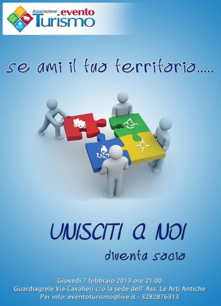 L’Associazione Evento Turismo ti invita Giovedì 7 Febbraio 2013 alle ore 21.00, in Via Cavalieri a Guardiagrele presso la sede dell’Ass. “Le Arti Antiche” (sopra la Banca Maonte Paschi di Siena), a passare una piacevole serata al fine di conoscere l’Associazione, i soci e le attività in corso e da realizzare.