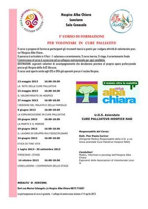 L’Azienda sanitaria locale Lanciano Vasto Chieti organizza un corso di formazione per fornire strumenti teorici e pratici a chi intende svolgere attività di volontariato presso l’Hospice Alba Chiara di Lanciano. La struttura, inaugurata dalla Asl nel 2011, ospita pazienti oncologici bisognosi di cure finalizzate al controllo del dolore e di altri sintomi che generano sofferenza. Responsabile è il dottor Pier Paolo Carinci.
