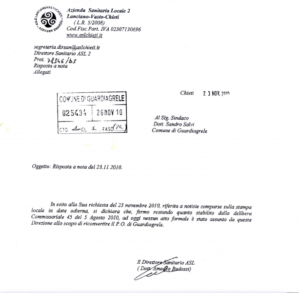 Nella nota, che si allega e che si chiede di pubblicare, si legge, infatti, che nessun provvedimento è stato ancora adottato (e questo nessuno lo ha mai detto) e si conferma il contenuto della delibera commissariale n. 45 dove è scritto che il presidio di Guardiagrele sarà disattivato e sostituito da un PTA.
