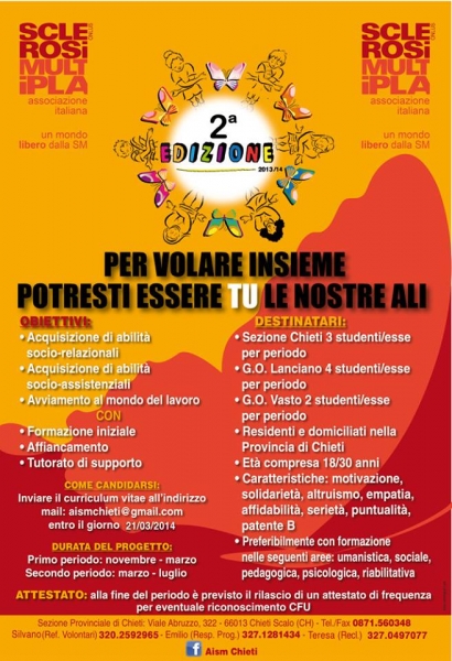 Nel 2012, per la prima volta nella Provincia di Chieti, si è avviato il progetto “Per volare insieme”, a cui hanno partecipato 8 giovani studenti dell’Università degli Studi “G. d’Annunzio”. In tal modo, l’AISM di Chieti è stata vicina alle esigenze e ai bisogni dei propri Soci (le persone con SM) e ai tanti interrogativi dei giovani universitari, che hanno vivacità intellettuale e spirito di solidarietà. Oggi, i giovani desiderano sempre più mettersi in gioco, per poter sperimentare sul campo i propri saperi e le proprie conoscenze: in AISM troveranno l’unica realtà d’Italia impegnata per “un mondo libero dalla SM” sin dal 1968.
