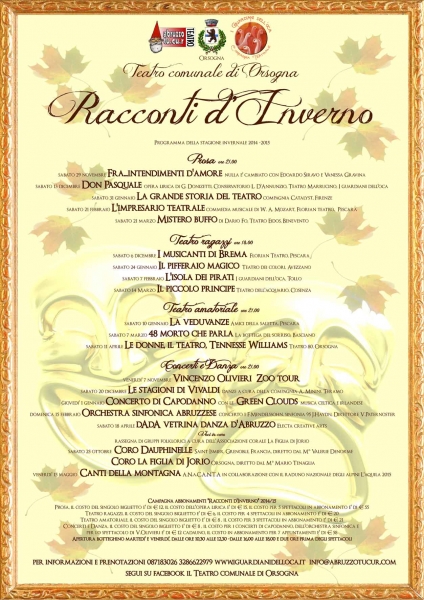 Compagnie teatrali, musicisti e danzatori dall'Abruzzo, e da tutta l'Italia, spettacoli teatrali di rilevanza nazionale come quello che vedrà protagonisti Edoardo Siravo e Vanessa Gravina, un opera lirica con più di trenta artisti, ben sette concerti tra cui quello di Vincenzo Olivieri o L'orchestra sinfonica abruzzese, il meglio della produzione del teatro amatoriale della regione, quattro appuntamenti di divertentissimi spettacoli per ragazzi, più le matinée per le scuole e perfino due spettacoli di danza, avranno il compito di traghettare gli spettatori attraverso tutto l'inverno fino alla primavera allietando, intrattenedo e facendo sognare tutti coloro che vorranno unirsi ai già molti che seguono Il teatro comunale di Orsogna e la simpatica compagnia dei guardiani dell'oca.