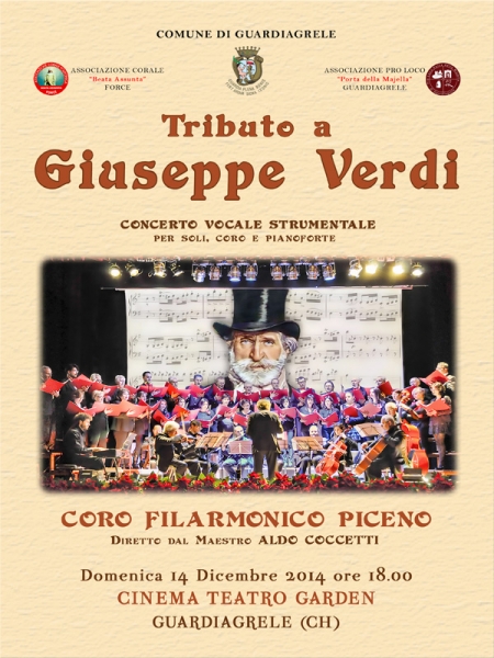 Domenica 14 dicembre alle ore 18, inizia ufficialmente il calendario "Guardiagrele d'inverno 2014/2015", con un "Tributo a Giuseppe Verdi" del Coro Filarmonico Piceno diretto dal M° Coccetti;