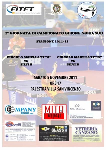 Sabato 5 novembre alle ore 17:00 presso al palestra comunale di Villa San Vincenzo prenderà il via il campionato 2011/2012 di Tennistavolo del girono nord-sud che ved impegnata la squadra Circolo Maiella tennitavolo.