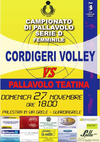 - la squadra di serie D femminile sarà impegnata nel campo di casa sempre Domenica 27 Novembre alle ore 18 contro l’ASD Pallavolo Teatina, 1° in classifica;