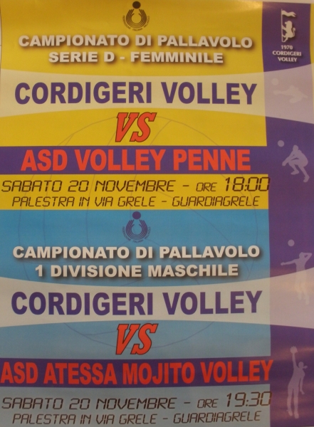 - Sabato 20 Novembre la 6° giornata di campionato di serie D femminile vedrà sfidarsi la G.S. Cordigeri Volley con l'ASD Volley Penne, alle ore 18.00 presso il Palazzetto in Via Grele, a seguire alle ore 19.30 la 1 Divisione Maschile si vedrà impegnata contro l'ASD Atessa Mojito Volley.