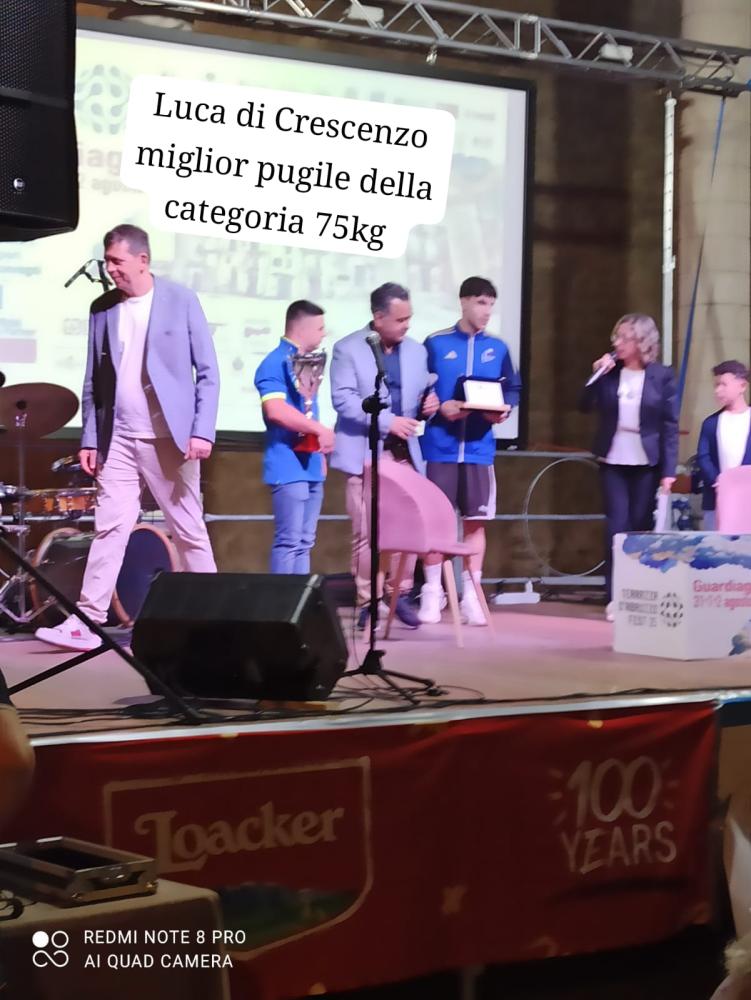 Durante la serata si sono svolte le premiazioni e il nostro campione Luca Di Crescenzo è stato premiato dal Coni in qualità di 2 volte campione regionale migliore pugile under 19 d'Abruzzo, di partecipante ai prossimi campionati nazionali. Luca è stato fino ad oggi convocato 3 volte in nazionale under 19.